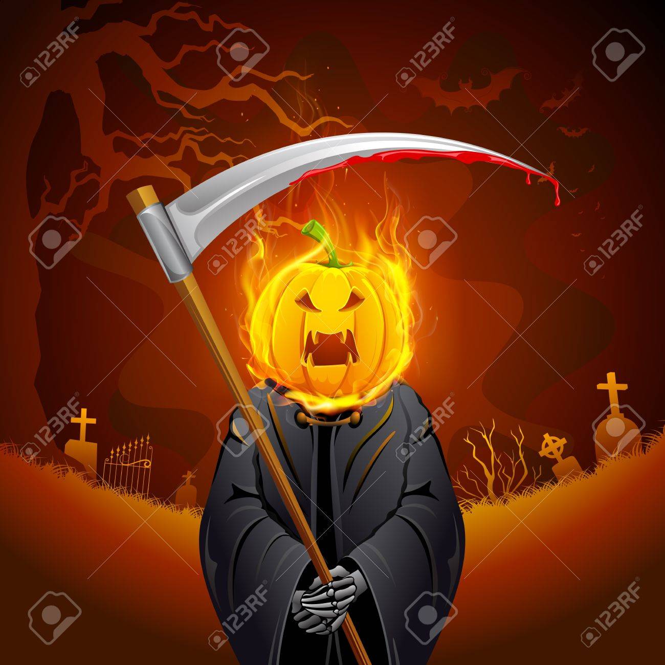 Filename : illustration-of-burning-halloween-grim-with-pumpkin-head-royalty.jpg